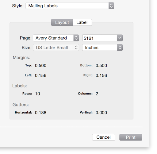 Print mailing labels, envelopes, and contact lists in Contacts on Mac ... Choose File > Print. Click the Style pop-up menu, then choose Mailing Labels. If you don't see the Style pop-up menu, click Show Details near the bottom-left corner. Click Layout or Label to customize mailing labels. Layout: Choose a label type, such as Avery Standard or A4. Or choose Define Custom to create and define your own label.