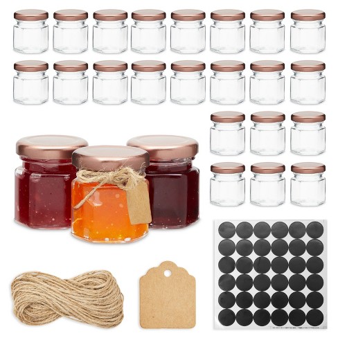 Sparkle and Bash 36 Pack 1.5oz 45ml Mini Hexagon Glass Jars with Lids, Hang Tags, Jute String for Honey, Jam & Jelly